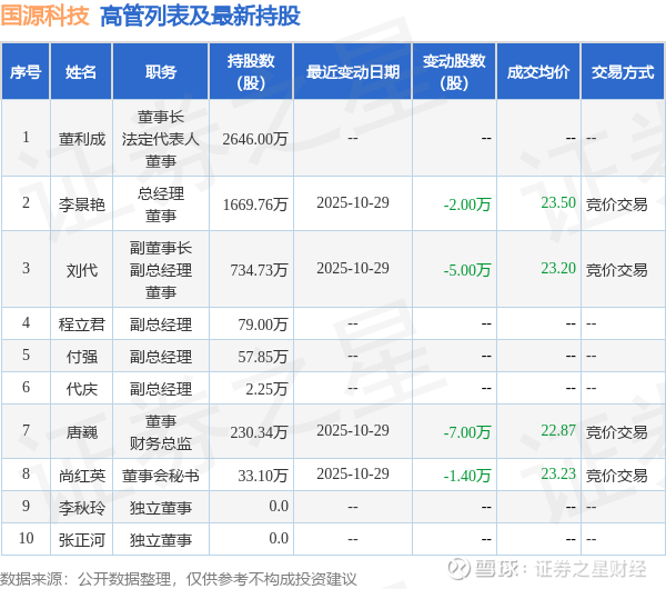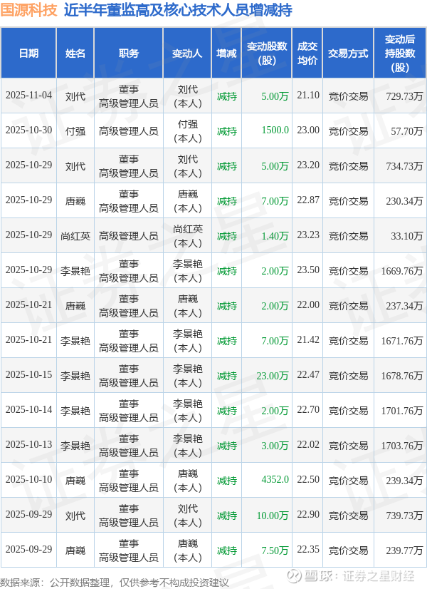 国源科技近半年内的董监高及核心技术人员增减持详情如下: