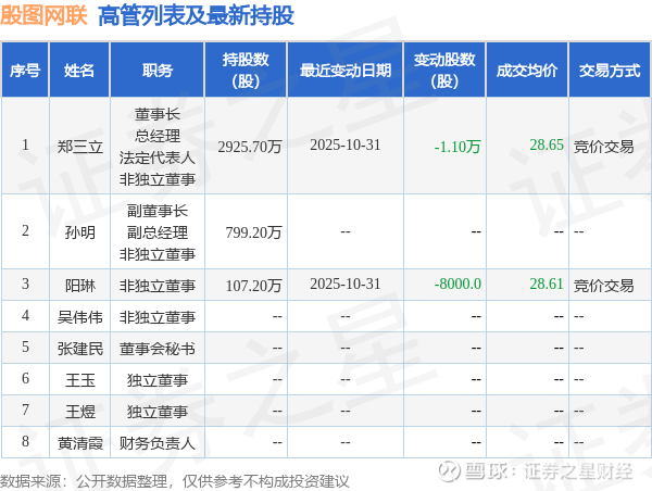 证券之星消息,根据11月6日市场公开信息、上市公司公告及交易所披露数据整理,殷图网联(920508)最新董监高及相关人员股份变动情况:2025年11月5日公司董事,高级管理人员郑三立、董事,高级管理人员孙明、董事阳琳共减持公司股份12.38万股,占公司总股本为0.2064%。变动期间公司股价上涨4.19%,11月5日当日收盘报28.13元。