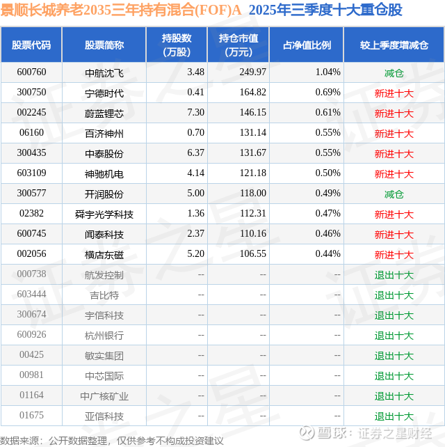 根据2025基金Q3季报公募基金重仓股数据,重仓该股的公募基金共2家,其中持有数量最多的公募基金为景顺长城基金的景顺长城养老2035三年持有混合(FOF)A。景顺长城养老2035三年持有混合(FOF)A目前规模为2.36亿元,最新净值1.0946(11月3日),较上一交易日上涨0.18%,近一年上涨20.23%。该公募基金现任基金经理为江虹。江虹在任的基金产品包括:景顺长城隽发平衡养老三年持有混合FOF,管理时间为2022年11月16日至今,期间收益率为16.82%;景顺长城保守养老一年持有混合(FOF)A,管理时间为2024年3月20日至今,期间收益率为7.89%;景顺长城臻品三个月持有期混合(FOF)A,管理时间为2024年12月26日至今,期间收益率为20.36%。