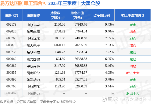 易方达国防军工混合A的前十大重仓股如下: