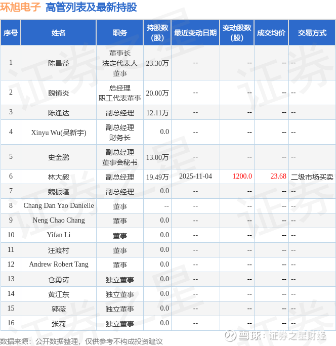 环旭电子的高管列表及最新持股情况如下: