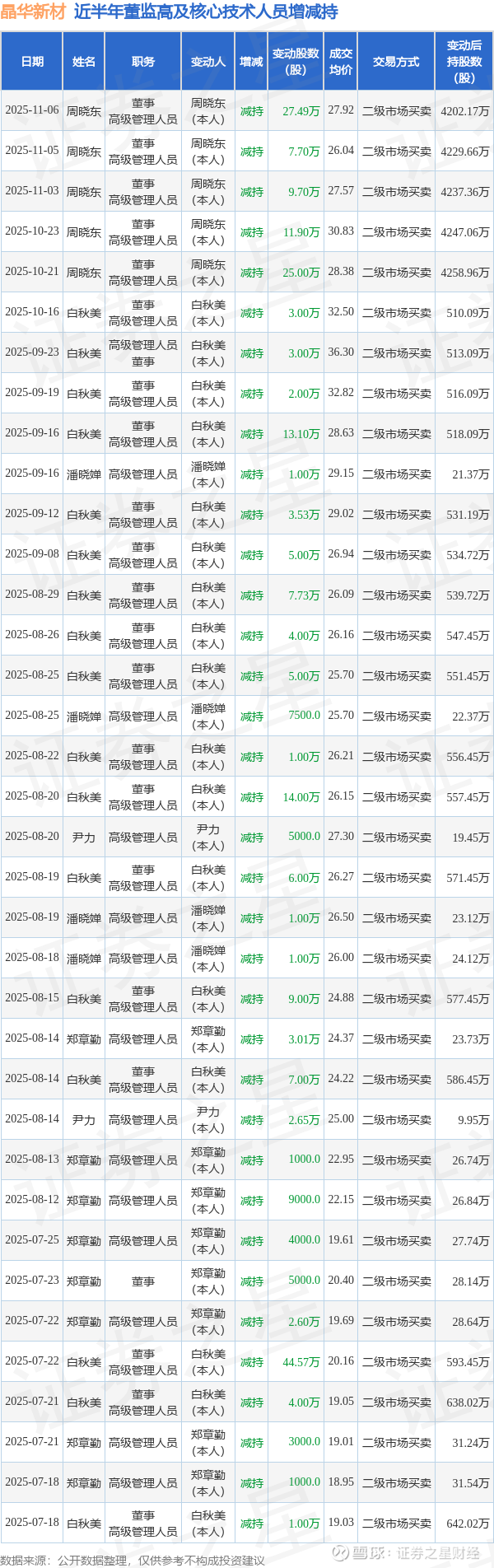 晶华新材近半年内的董监高及核心技术人员增减持详情如下: