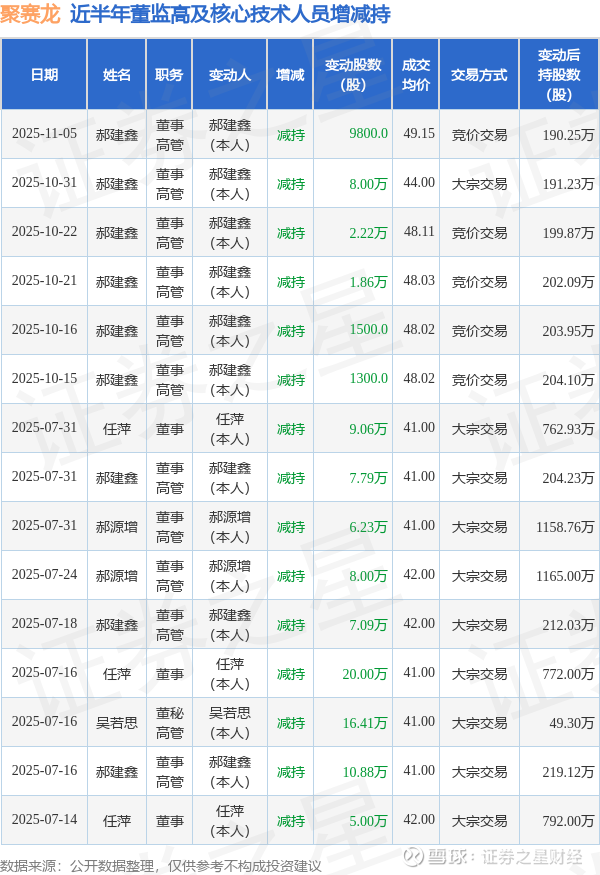 聚赛龙近半年内的董监高及核心技术人员增减持详情如下: