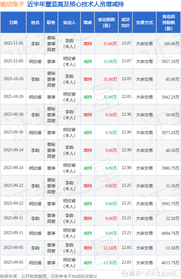 瑜欣电子近半年内的董监高及核心技术人员增减持详情如下: