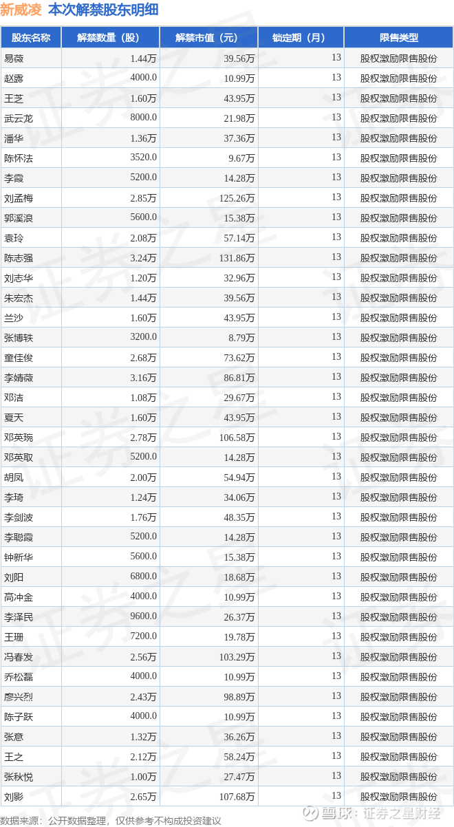 证券之星消息,根据市场公开信息整理,新威凌(920634)于11月7日将有53.31万股限售股份解禁,为公司股权激励限售股份,占公司总股本0.83%。(本次数据根据历史公告整理得出,实际情况以上市公司最新公告为准)最近一年内,该股累计解禁721.66万股,占总股本的11.29%。本次解禁后,公司还有2345.36万股限售股份,占总股本36.7%。具体如下图所示: