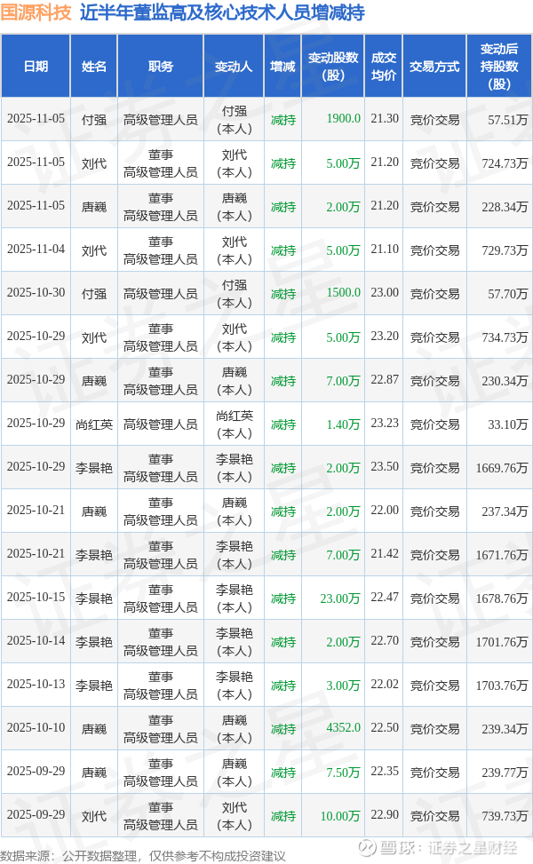 国源科技近半年内的董监高及核心技术人员增减持详情如下: