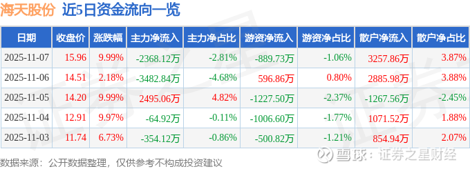 证券之星消息,海天股份11月7日涨停收盘,收盘价15.96元。该股于13点16分涨停,未打开涨停,截止收盘封单资金为1619.75万元,占其流通市值0.22%。