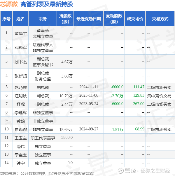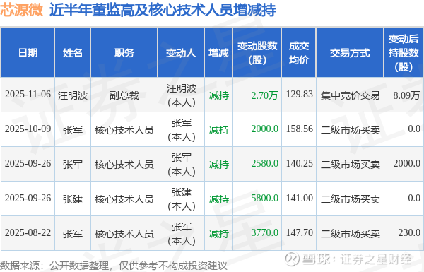 芯源微近半年内的董监高及核心技术人员增减持详情如下: