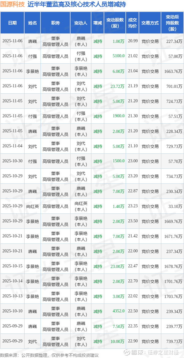国源科技近半年内的董监高及核心技术人员增减持详情如下: