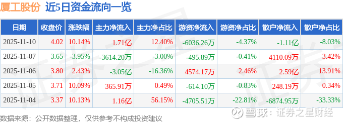 证券之星消息,厦工股份11月10日涨停收盘,收盘价4.02元。该股于13点44分涨停,3次打开涨停,截止收盘封单资金为496.39万元,占其流通市值0.07%。