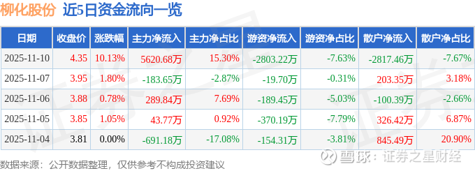 证券之星消息,柳化股份11月10日涨停收盘,收盘价4.35元。该股于9点52分涨停,5次打开涨停,截止收盘封单资金为877.93万元,占其流通市值0.25%。
