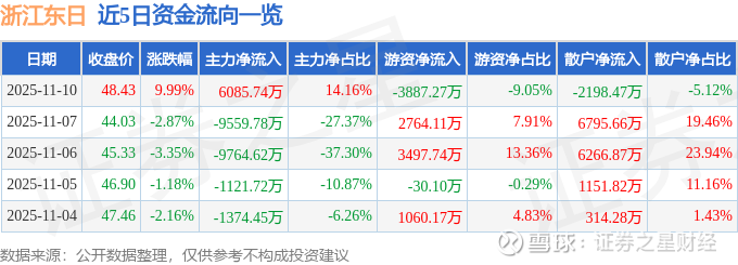 证券之星消息,浙江东日11月10日涨停收盘,收盘价48.43元。该股于10点9分涨停,未打开涨停,截止收盘封单资金为6069.86万元,占其流通市值0.3%。