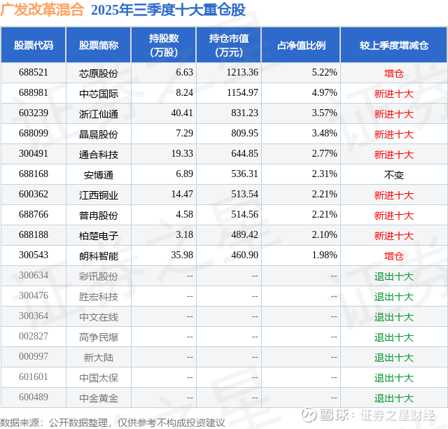 根据2025基金Q3季报公募基金重仓股数据,重仓该股的公募基金共1家,其中持有数量最多的公募基金为广发基金的广发改革混合。广发改革混合目前规模为2.33亿元,最新净值1.1(11月7日),较上一交易日下跌0.63%,近一年上涨16.65%。该公募基金现任基金经理为陈少平。