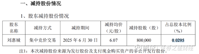 据公司9月发布的减持公告,刘惠城在2025年6月30日,以6.07元/股的均价,共减持80万股股份,减持比例为0.0295%。经计算,刘惠城此次减持共套现485.6万元。三季报显示,截至报告期末,刘惠城持股比例为6.13%,为公司第一大股东。