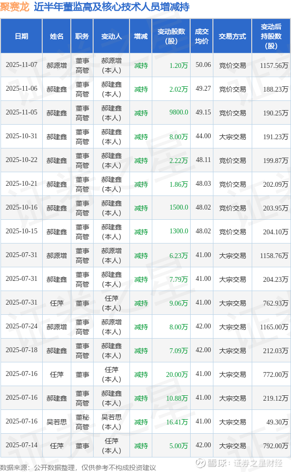 聚赛龙近半年内的董监高及核心技术人员增减持详情如下: