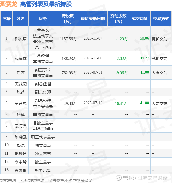 聚赛龙的高管列表及最新持股情况如下: