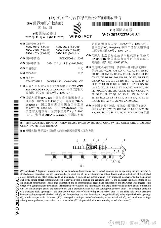 证券之星消息,根据企查查数据显示中科微至(688211)公布了一项国际专利申请,专利名为“基于双向摆轮结构的物流运输装置及其工作方法”,专利申请号为PCT/CN2024/119203,国际公布日为2025年11月6日。