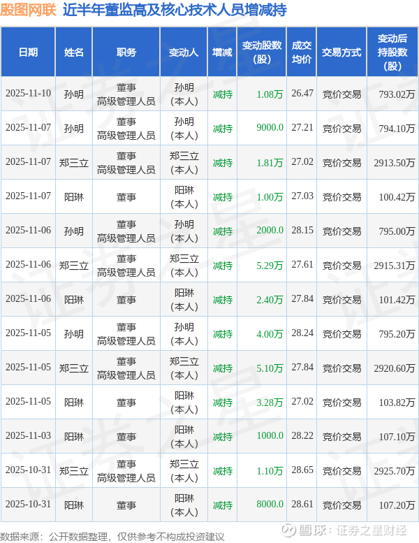 殷图网联近半年内的董监高及核心技术人员增减持详情如下: