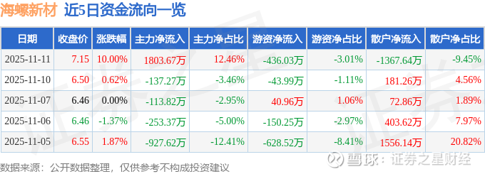 11月11日的资金流向数据方面,主力资金净流入1803.67万元,占总成交额12.46%,游资资金净流出436.03万元,占总成交额3.01%,散户资金净流出1367.64万元,占总成交额9.45%。