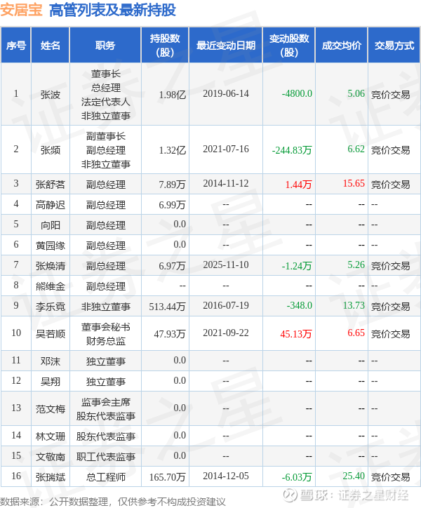 安居宝近半年内的董监高及核心技术人员增减持详情如下: