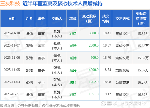 三友科技近半年内的董监高及核心技术人员增减持详情如下: