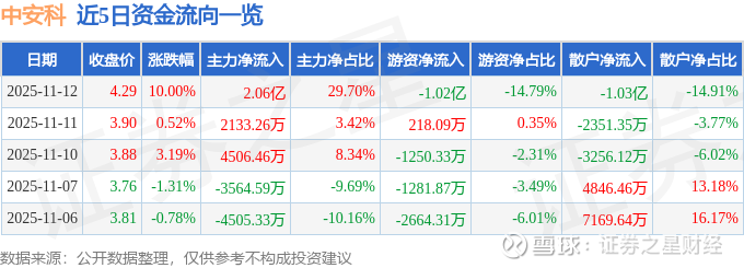 证券之星消息,中安科11月12日涨停收盘,收盘价4.29元。该股于9点39分涨停,2次打开涨停,截止收盘封单资金为4988.5万元,占其流通市值0.5%。