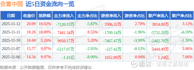 证券之星消息,合富中国11月12日涨停收盘,收盘价20.09元。该股于9点30分涨停,6次打开涨停,截止收盘封单资金为1.15亿元,占其流通市值1.44%。