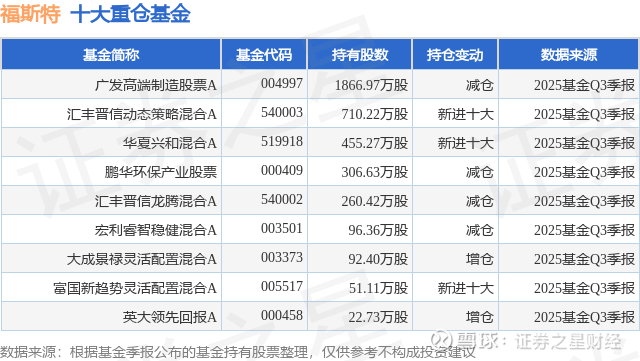 根据2025基金Q3季报公募基金重仓股数据,重仓该股的公募基金共9家,其中持有数量最多的公募基金为广发基金的广发高端制造股票A。广发高端制造股票A目前规模为44.24亿元,最新净值1.5951(11月11日),较上一交易日上涨1.21%,近一年下跌0.88%。该公募基金现任基金经理为郑澄然。郑澄然在任的基金产品包括:广发鑫享灵活配置混合A,管理时间为2020年5月20日至今,期间收益率为56.74%;广发兴诚混合A,管理时间为2021年1月6日至今,期间收益率为-47.29%;广发诚享混合A,管理时间为2021年2月8日至今,期间收益率为-47.36%。