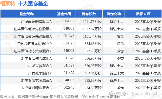 根据2025基金Q3季报公募基金重仓股数据,重仓该股的公募基金共10家,其中持有数量最多的公募基金为广发基金的广发高端制造股票A。广发高端制造股票A目前规模为44.24亿元,最新净值1.5951(11月11日),较上一交易日上涨1.21%,近一年下跌0.88%。该公募基金现任基金经理为郑澄然。郑澄然在任的基金产品包括:广发鑫享灵活配置混合A,管理时间为2020年5月20日至今,期间收益率为56.74%;广发兴诚混合A,管理时间为2021年1月6日至今,期间收益率为-47.29%;广发诚享混合A,管理时间为2021年2月8日至今,期间收益率为-47.36%。