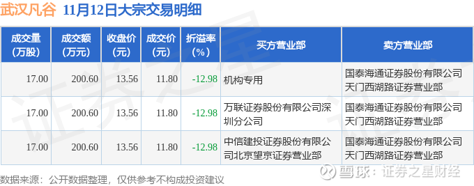 证券之星消息,11月12日武汉凡谷发生大宗交易,交易数据如下: