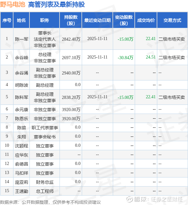 野马电池近半年内的董监高及核心技术人员增减持详情如下: