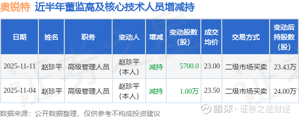 奥锐特近半年内的董监高及核心技术人员增减持详情如下: