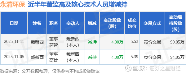 证券之星消息,根据11月12日市场公开信息、上市公司公告及交易所披露数据整理,永清环保(300187)最新董监高及相关人员股份变动情况:2025年11月11日公司董事,高管戴新西共减持公司股份4.0万股,占公司总股本为0.0062%。变动期间公司股价上涨0.55%,11月11日当日收盘报5.5元。