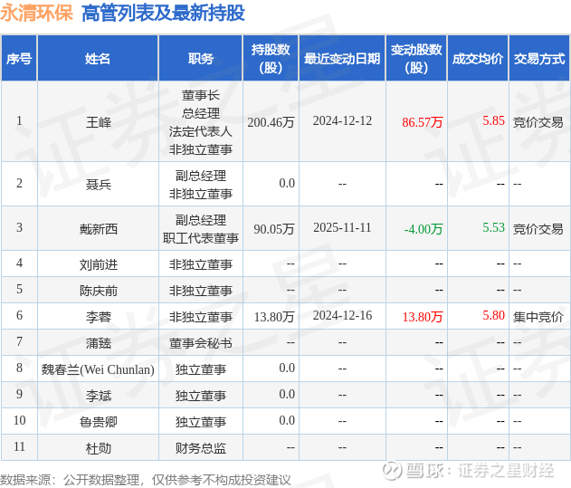 永清环保近半年内的董监高及核心技术人员增减持详情如下: