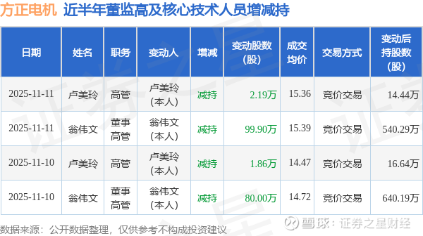 方正电机近半年内的董监高及核心技术人员增减持详情如下: