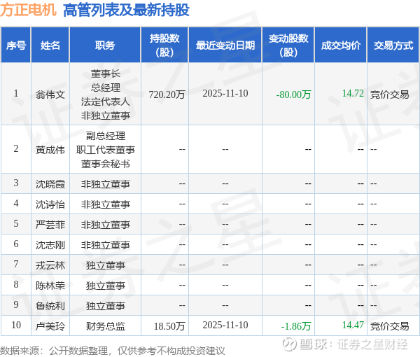 证券之星消息,根据11月12日市场公开信息、上市公司公告及交易所披露数据整理,方正电机(002196)最新董监高及相关人员股份变动情况:2025年11月11日公司董事,高管翁伟文、高管卢美玲共减持公司股份102.09万股,占公司总股本为0.2059%。变动期间公司股价上涨9.98%,11月11日当日收盘报15.98元。