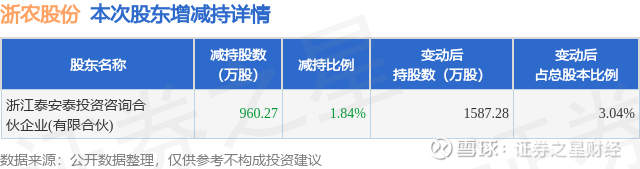 证券之星消息,11月12日浙农股份发布公告《浙农股份:关于股东减持计划实施完成暨减持结果公告》,其股东浙江泰安泰投资咨询合伙企业(有限合伙)于2025年10月30日至2025年11月11日间合计减持960.27万股,占公司目前总股本的1.8417%,变动期间该股股价上涨2.43%,截止11月11日收盘报9.69元。