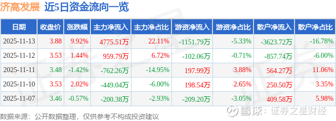 证券之星消息,济高发展11月13日涨停收盘,收盘价3.88元。该股于9点30分涨停,3次打开涨停,截止收盘封单资金为2368.24万元,占其流通市值0.78%。
