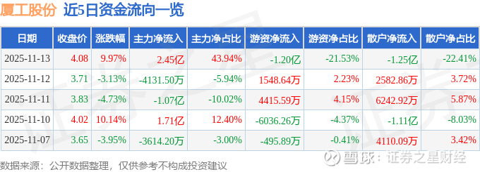 11月13日的资金流向数据方面,主力资金净流入2.45亿元,占总成交额43.94%,游资资金净流出1.2亿元,占总成交额21.53%,散户资金净流出1.25亿元,占总成交额22.41%。