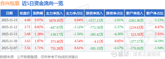 证券之星消息,合兴包装11月13日涨停收盘,收盘价4.08元。该股于13点18分涨停,未打开涨停,截止收盘封单资金为5938.66万元,占其流通市值1.2%。