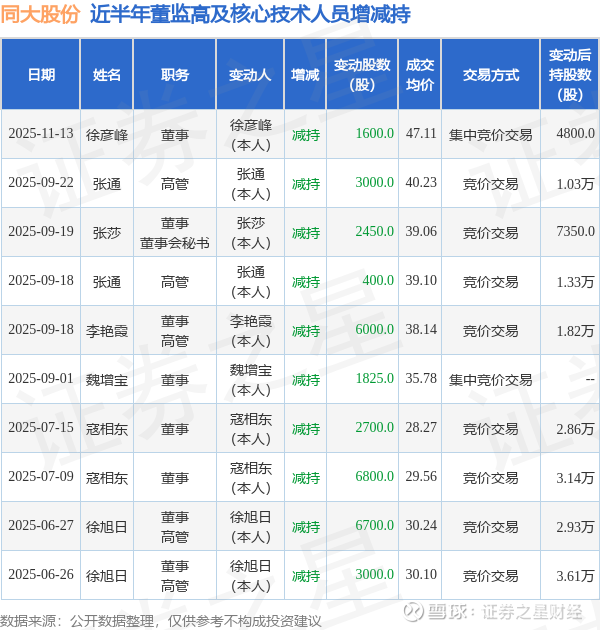 同大股份近半年内的董监高及核心技术人员增减持详情如下: