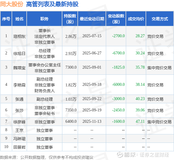 同大股份的高管列表及最新持股情况如下: