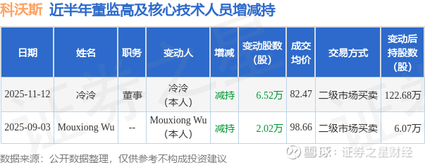 证券之星消息,根据11月13日市场公开信息、上市公司公告及交易所披露数据整理,科沃斯(603486)最新董监高及相关人员股份变动情况:2025年11月12日公司董事冷泠共减持公司股份6.52万股,占公司总股本为0.0113%。变动期间公司股价下跌0.64%,11月12日当日收盘报81.8元。