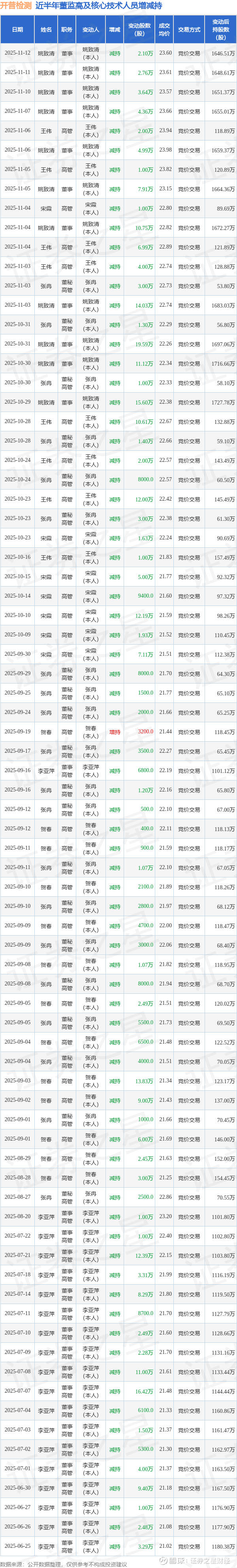 开普检测近半年内的董监高及核心技术人员增减持详情如下: