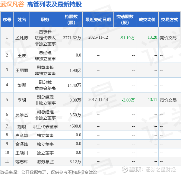 武汉凡谷近半年内的董监高及核心技术人员增减持详情如下: