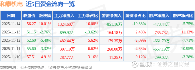 11月14日的资金流向数据方面,主力资金净流入1324.6万元,占总成交额16.08%,游资资金净流出851.16万元,占总成交额10.33%,散户资金净流出473.44万元,占总成交额5.75%。