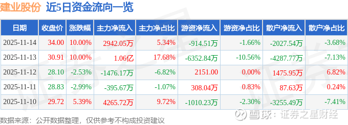 证券之星消息,建业股份11月14日涨停收盘,收盘价34.0元。该股于9点48分涨停,未打开涨停,截止收盘封单资金为5164.63万元,占其流通市值0.93%。