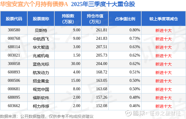 根据2025基金Q3季报公募基金重仓股数据,重仓该股的公募基金共1家,其中持有数量最多的公募基金为华宝基金的华宝安宜六个月持有债券A。华宝安宜六个月持有债券A目前规模为0.71亿元,最新净值1.1371(11月13日),较上一交易日上涨0.04%,近一年上涨6.46%。该公募基金现任基金经理为李栋梁。李栋梁在任的基金产品包括:华宝宝康债券A,管理时间为2011年6月28日至今,期间收益率为86.89%;华宝可转债债券A,管理时间为2016年6月1日至今,期间收益率为94.3%;华宝新飞跃灵活配置混合,管理时间为2017年2月27日至今,期间收益率为137.92%;华宝双债增强债券A,管理时间为2021年4月23日至今,期间收益率为20.62%。