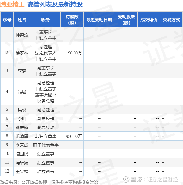 腾亚精工的高管列表及最新持股情况如下: