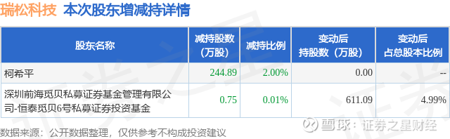 证券之星消息,11月14日瑞松科技发布公告《瑞松科技:关于股东减持股份结果公告》,其股东深圳前海觅贝私募证券基金管理有限公司-恒泰觅贝6号私募证券投资基金、柯希平于2025年8月21日至2025年11月14日间合计减持245.65万股,占公司目前总股本的2.0075%,变动期间该股股价上涨10.01%,截止11月14日收盘报39.78元。